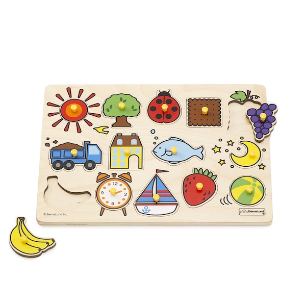 指先あそび、パズルあそびの入口として欠かせないピックアップパズル。このパズルには下絵がなく、ピースのかたちだけを頼りに「さかな」や「ぶどう」、「ヨット」など14種類の様々なかたちの認識を促す、シリーズの中で一番難易度の高いパズルとなっています。まるいかたちは「おひさま」・「とけい」・「ボール」に使われていますが、それぞれ大きさは異なりますので、正しい位置におかないときちんとはまりません。また、ピースのモチーフは、お子さまの生活に親しみのあるものを選びました。あそびながら、お話の練習にもなりますね。商品スペック