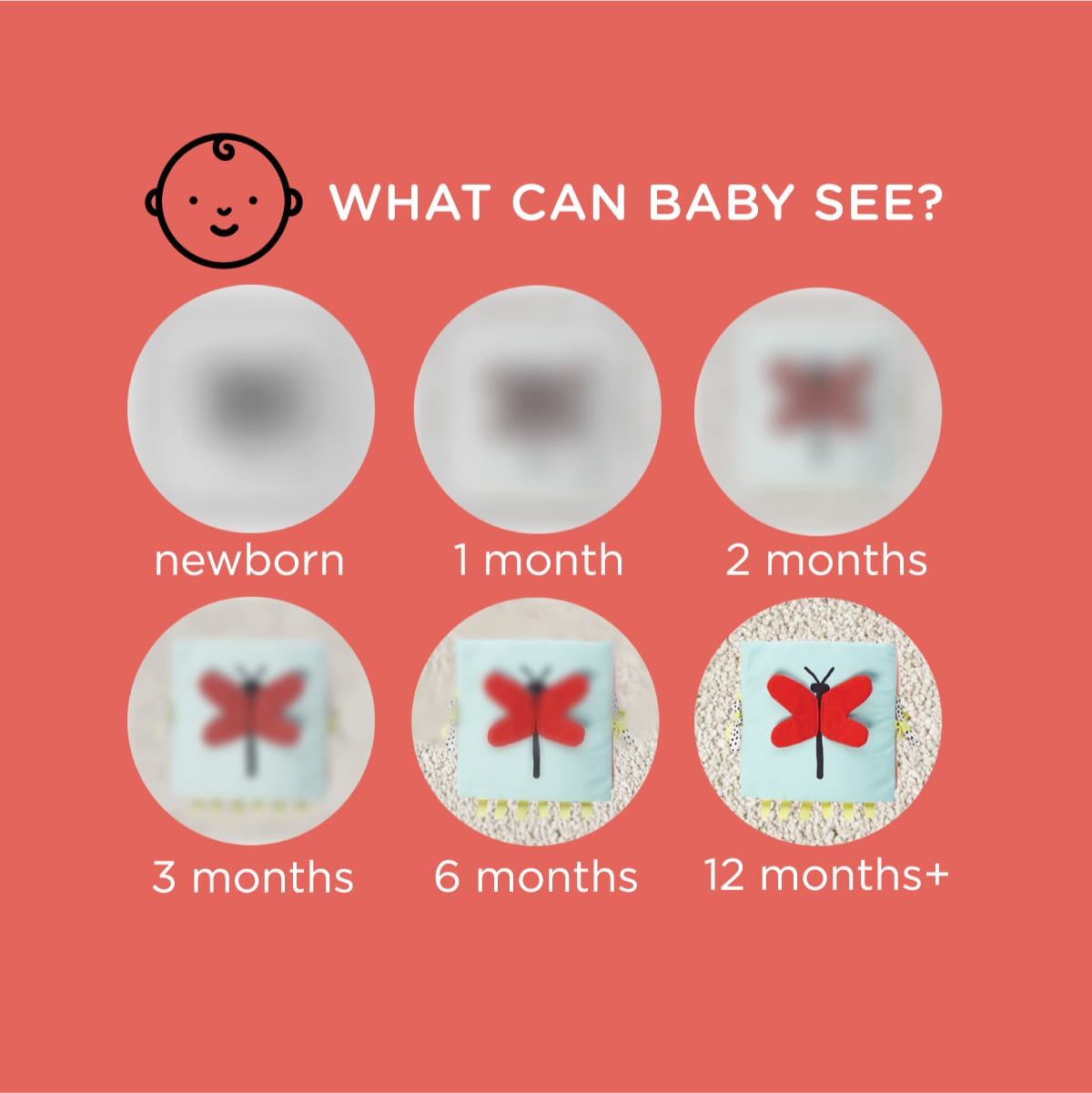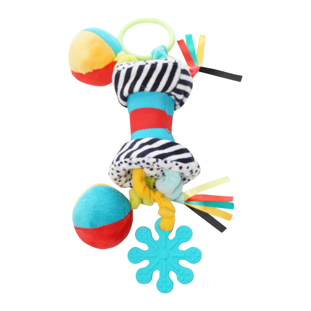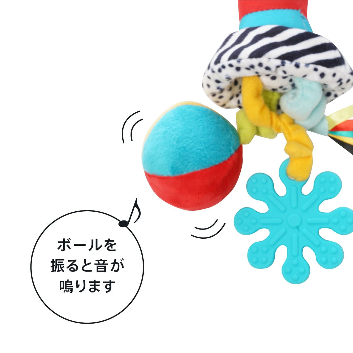 ストライプと水玉の布地はパリパリと大きな音と感触。手を伸ばし握ることができたら、振る、ひっぱる、口に入れるなど、いろんな方向に多様な動きが自然に生まれます。●5種のしかけ