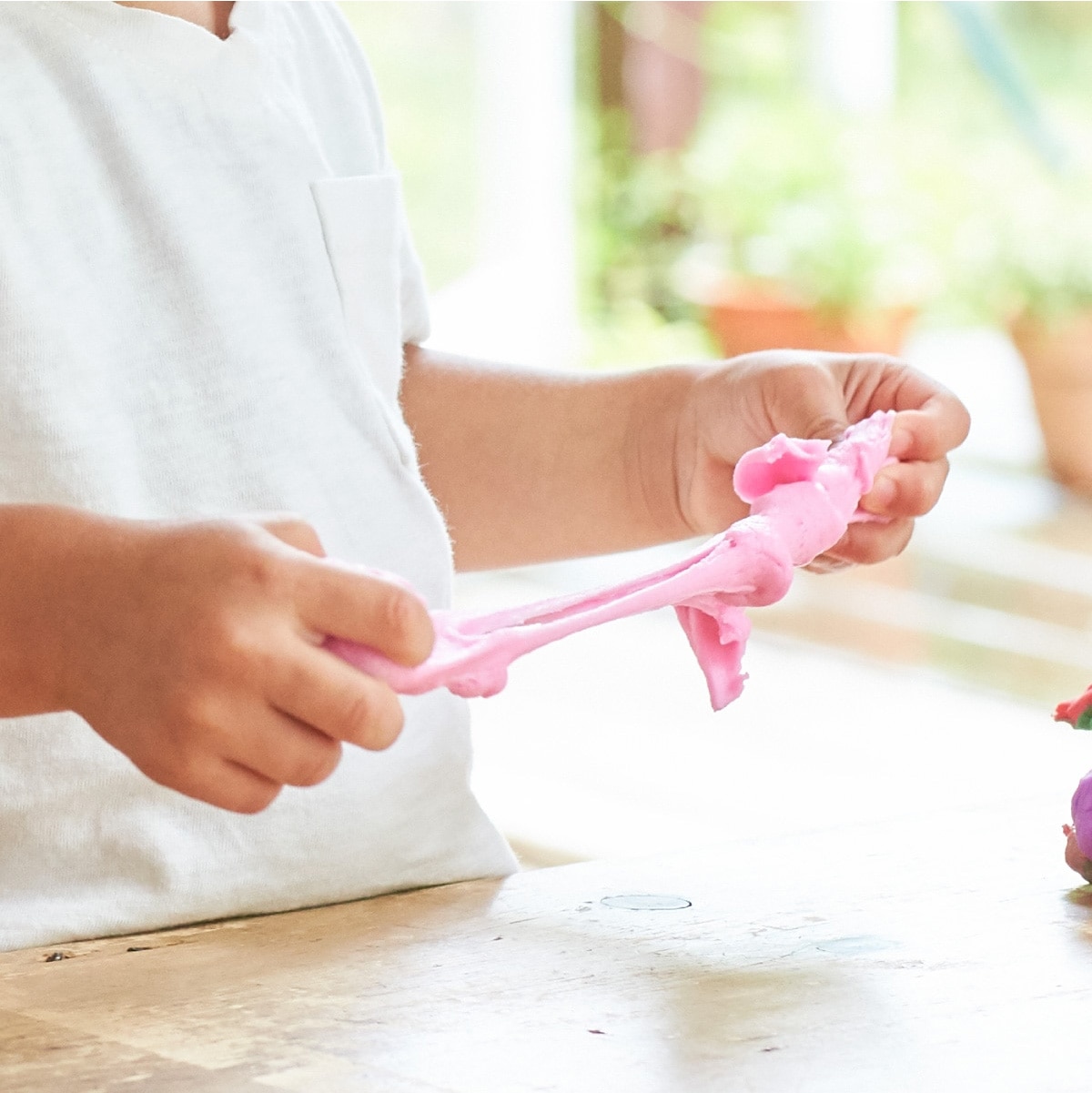 防腐剤、保存剤は一切含まず、防腐剤のかわりとして「にがり」を使用。小さな子どもが誤って口に入れても、にがいので飲み込むのを避けられます。原材料の寒天はアレルギーの心配が少なく、肌の敏感な子どもにも安心して遊んでいただけます(※)。