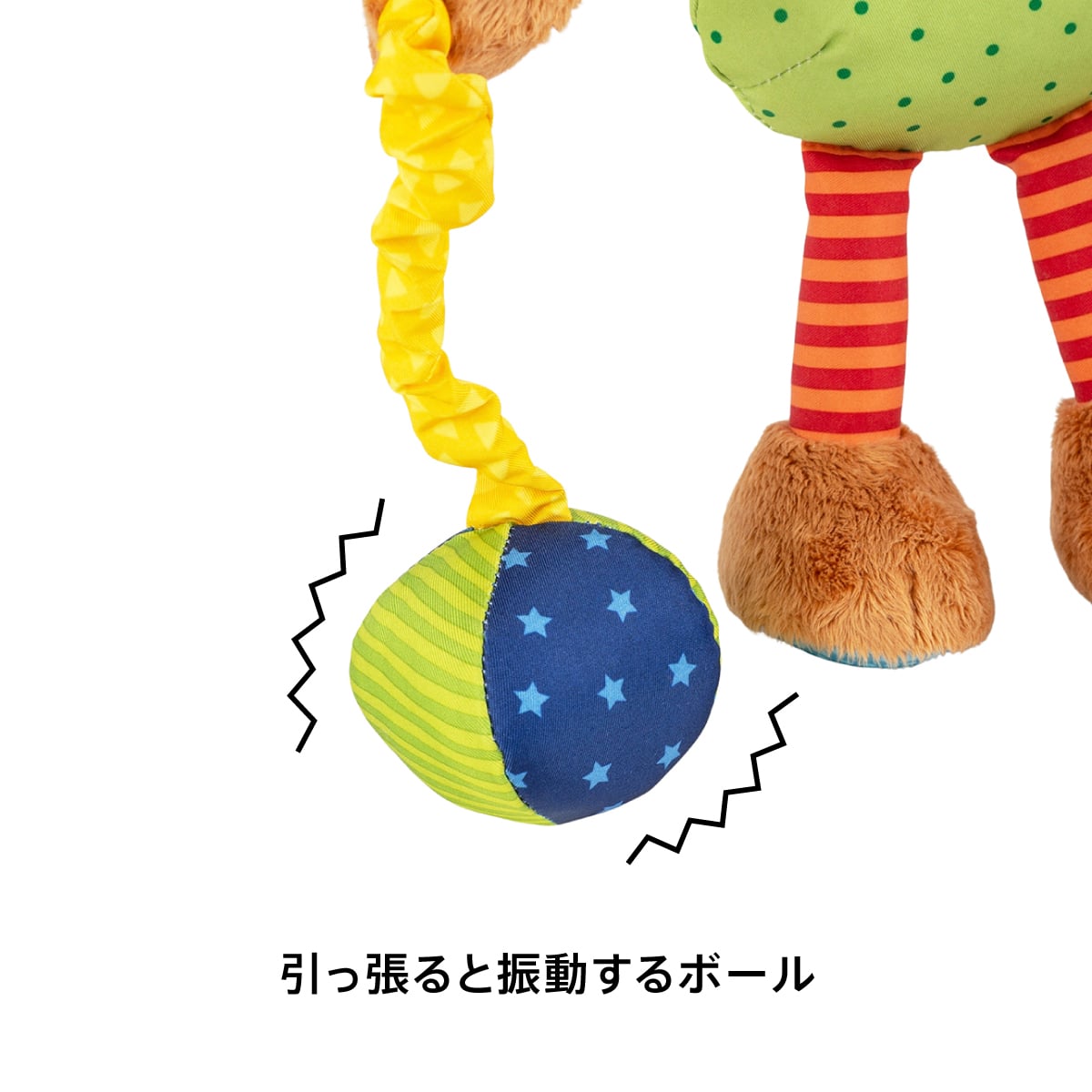 笑った顔がついた、ふわふわと優しい手触りのぬいぐるみです。体や手足などに歯固め・鈴の音などのしかけがついていて、子どもの触覚を刺激します。手から伸びたヒモを引っぱれば、全身がブルブルと震えます。メーカー紹介