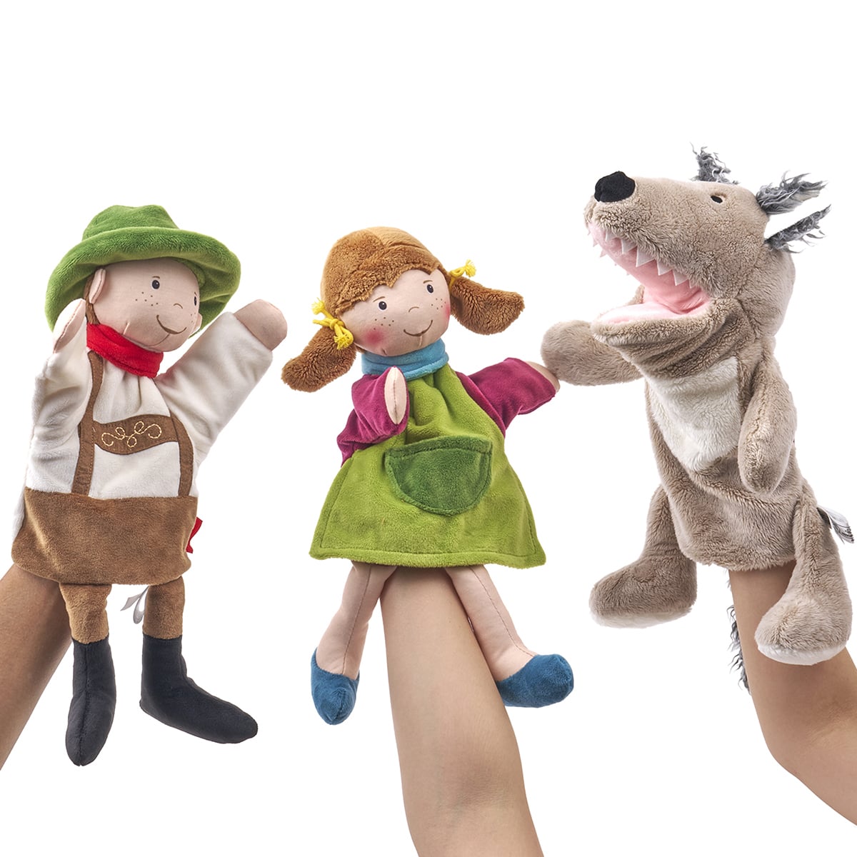 歩いたり、座ったりする様子も再現できる、足も付いているのが特徴のハンドパペット。人形の体全体を表現して遊ぶことができます。手を入れていろいろな動きや気持ちを表現できるパペットは、子どもの気持ちを表現する手助けとなり、年齢に応じてあそび方も広がります。