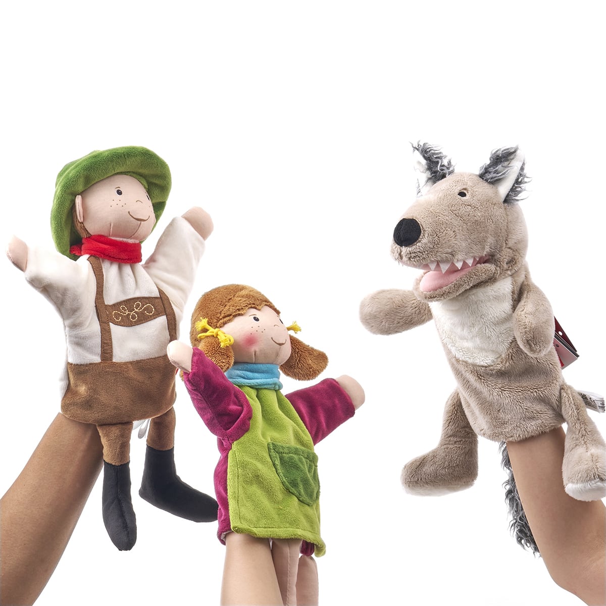 歩いたり、座ったりする様子も再現できる、足も付いているのが特徴のハンドパペット。人形の体全体を表現して遊ぶことができます。手を入れていろいろな動きや気持ちを表現できるパペットは、子どもの気持ちを表現する手助けとなり、年齢に応じてあそび方も広がります。
