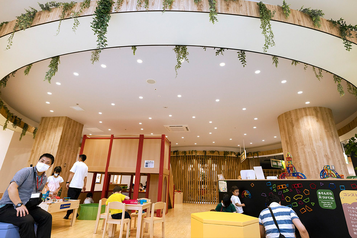 子どものあそび場において見落とされがちなのが、子どもを見守る大人の居心地の良さ。仕事に家事、そして子育てと毎日慌ただしく過ごす大人にも、ホッと一息ついてリフレッシュできる場所が必要です。子どもの健やかな成長のために、大人も心身ともに元気に楽しく子育てしてほしい。こういった想いから、大人もリラックスできるように空間全体をやわらかな木のトーンで統一し、照明位置や明るさにもこだわりました。