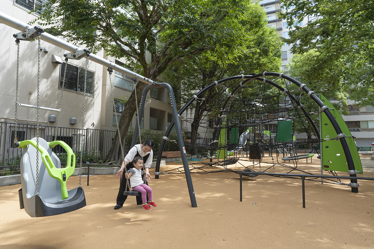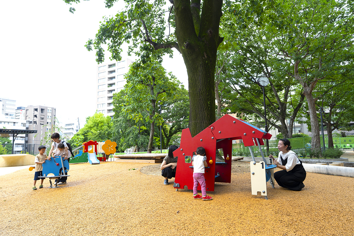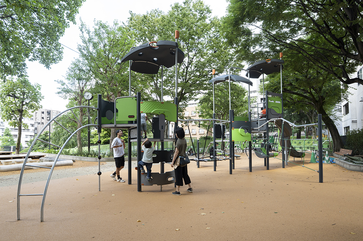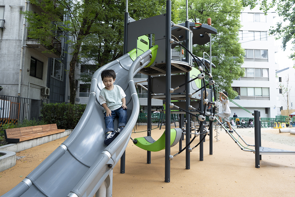 リニューアルにあたっては、法政大学景観研究室による調査や地域住民による協議会が開催され、スロープの設置や植栽計画など、細部に至るまで、多角的な視点で「居心地のよい場所づくり」が検討されました。「保育園のお散歩で立ち寄る小さな子どもから、放課後に遊びに来る小学生まで、地域の子どもたちの誰もが安全にあそびを楽しめる環境を」という市民のリクエストに応えるため、公園の上段エリア(遊具エリア)の遊具の入れ替えも行われました。