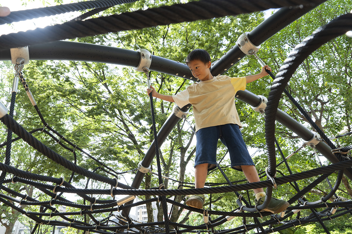 ネット型ドームではロープを握ってのぼりながら、自分の力を試すことができます。自分のからだがどこまで届くのかを確かめつつ、手足の協応動作をくり返して頂上を目指します。到達後には、公園内や街並みを一望しながら達成感を味わうことができます。
