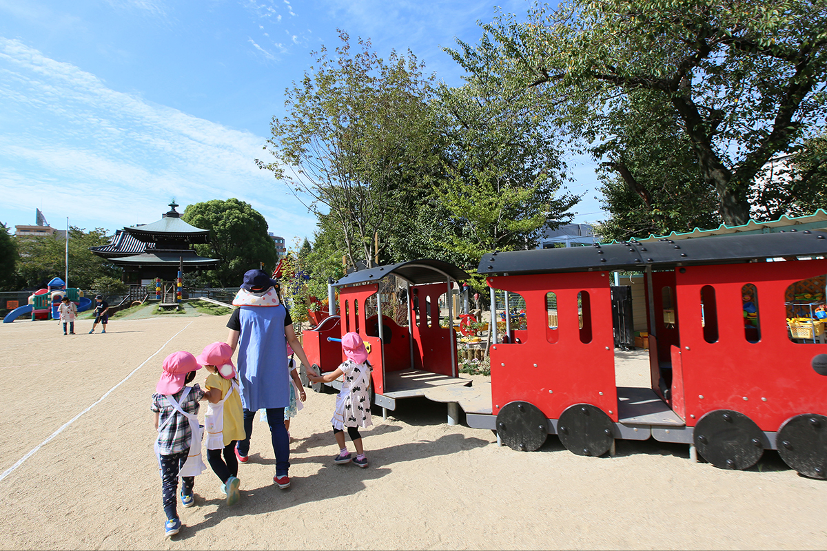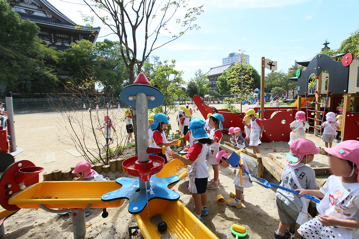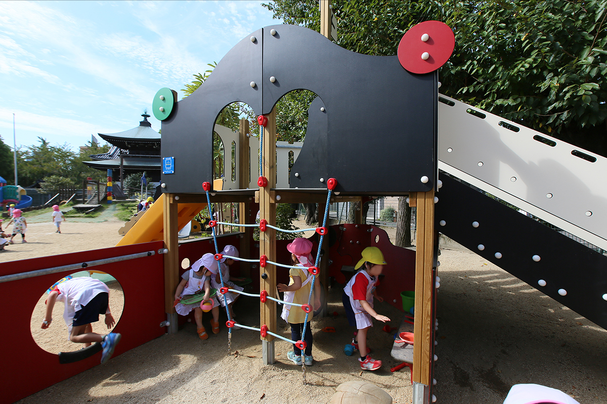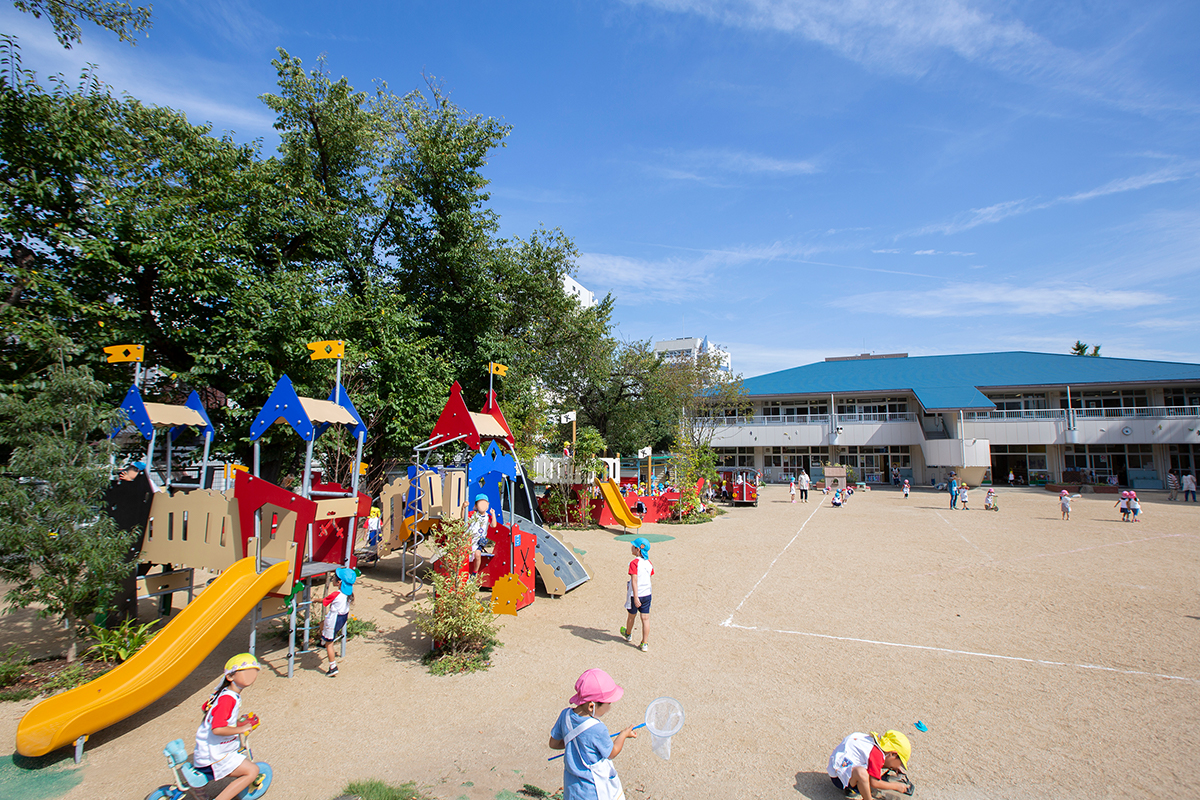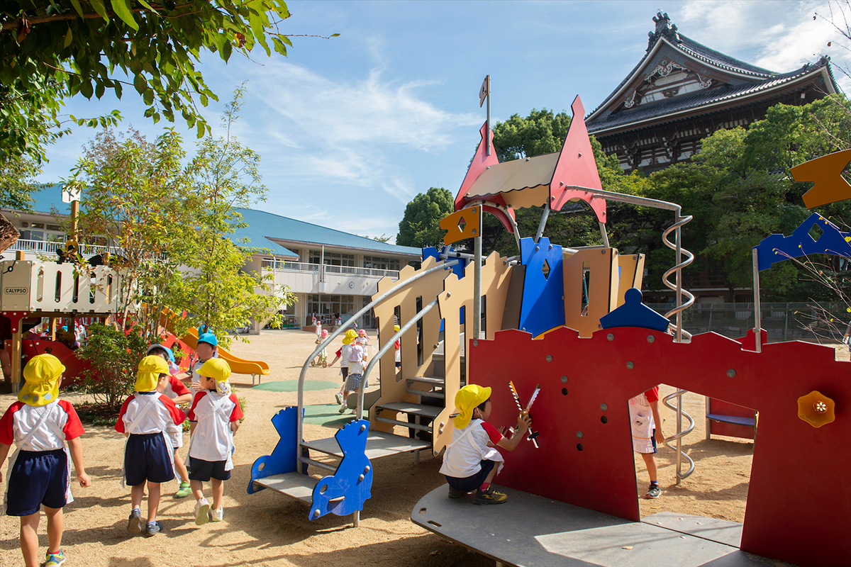 緑豊かな環境で、子どもたちが毎日のびのびと活動しているお東幼稚園。今回、市内でも有数の広さを誇るその園庭で、より多様なあそびを体験できるよう遊具の新規導入と園庭リニューアルを行いました。