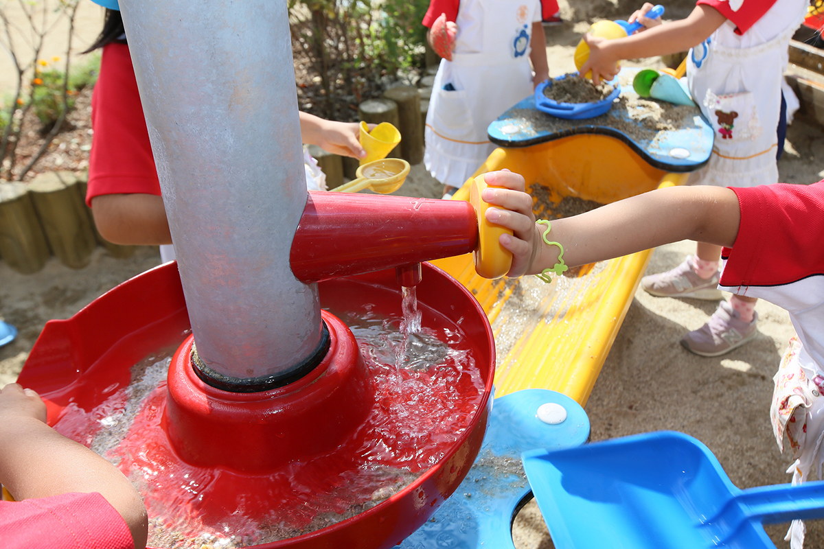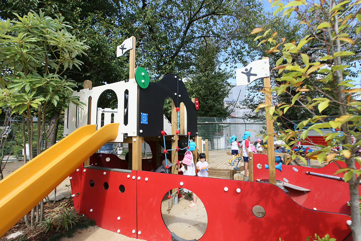 「お庭で遊ぶ時間になると、子どもたちは一目散にポンプのところへ走っていきます。それほど、水に触れることができる砂場の水路は人気ですね。鬼ごっこを始める時は、探検船を基地にして遊んでいて、遊具をきっかけにあそびが膨らんでいるなと感じます。お城の遊具にはチャレンジする動きが多いため、遊ぶたびに『先生みてみて!これできたよ!』と話してくれます。遊びながら、チャレンジする楽しさと達成感を感じているようです。」