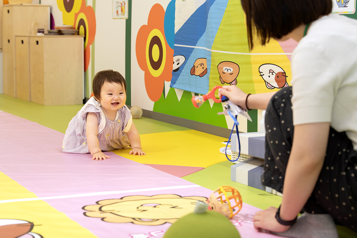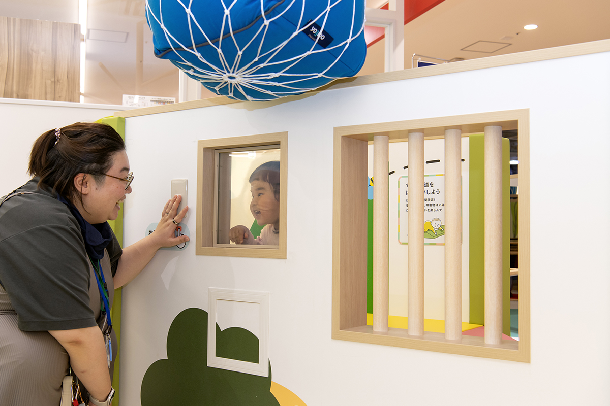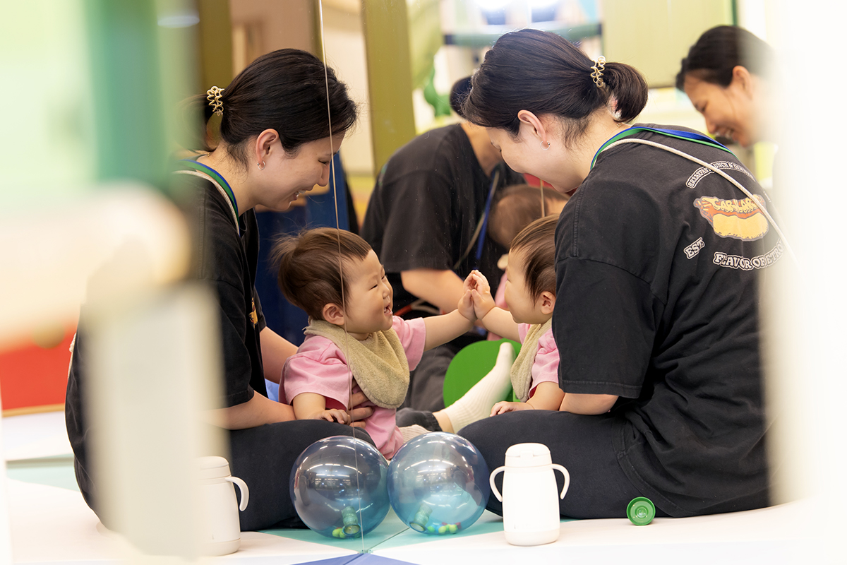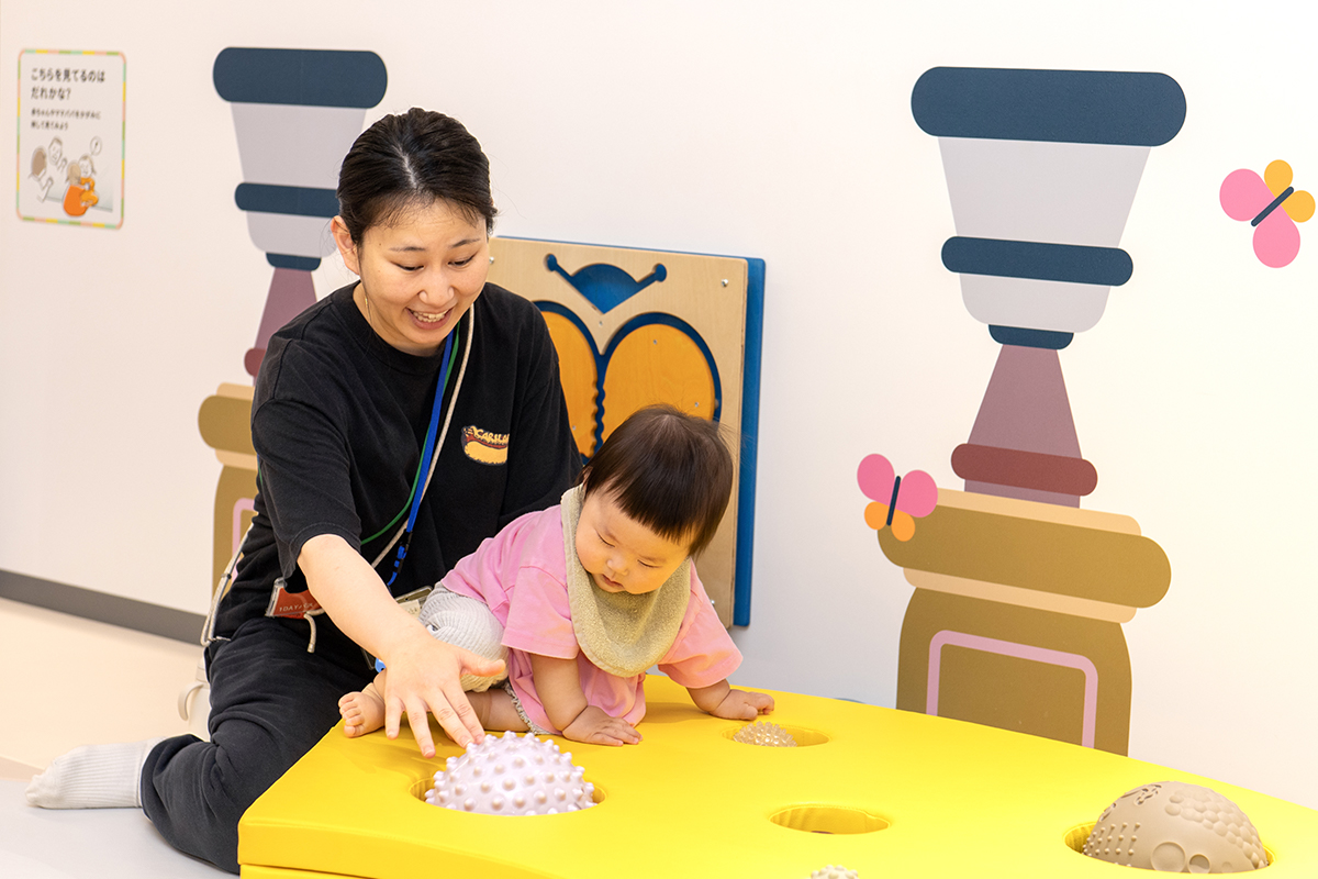 エリア内には、月齢に合わせて楽しめる遊具のほか、鏡に映る自分を見て発見するできるしかけ、手・指を使って質感の違いを楽しむボールや芝など、赤ちゃんの好奇心を刺激し、五感を育む工夫を随所に取り入れています。