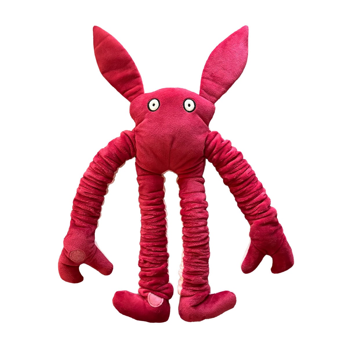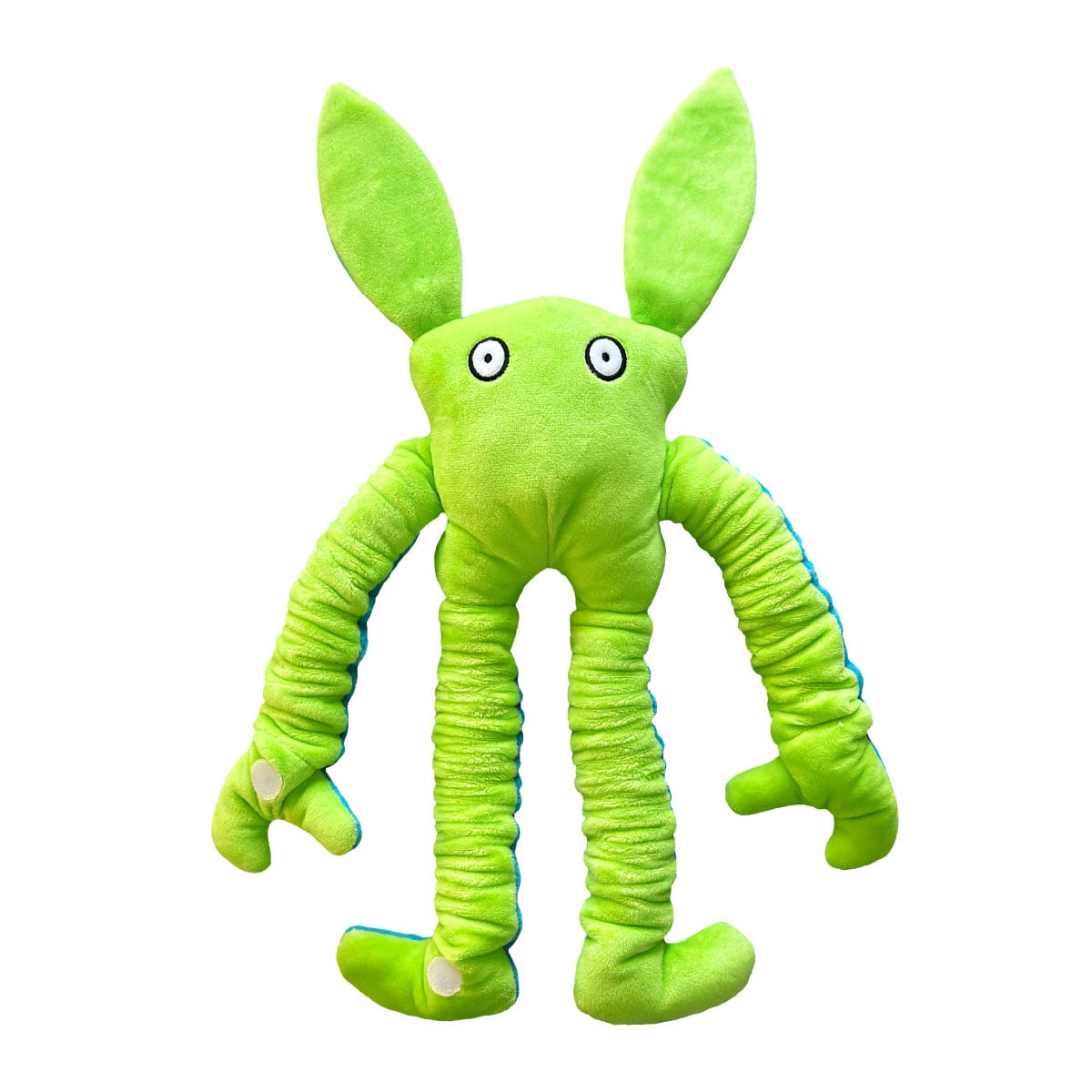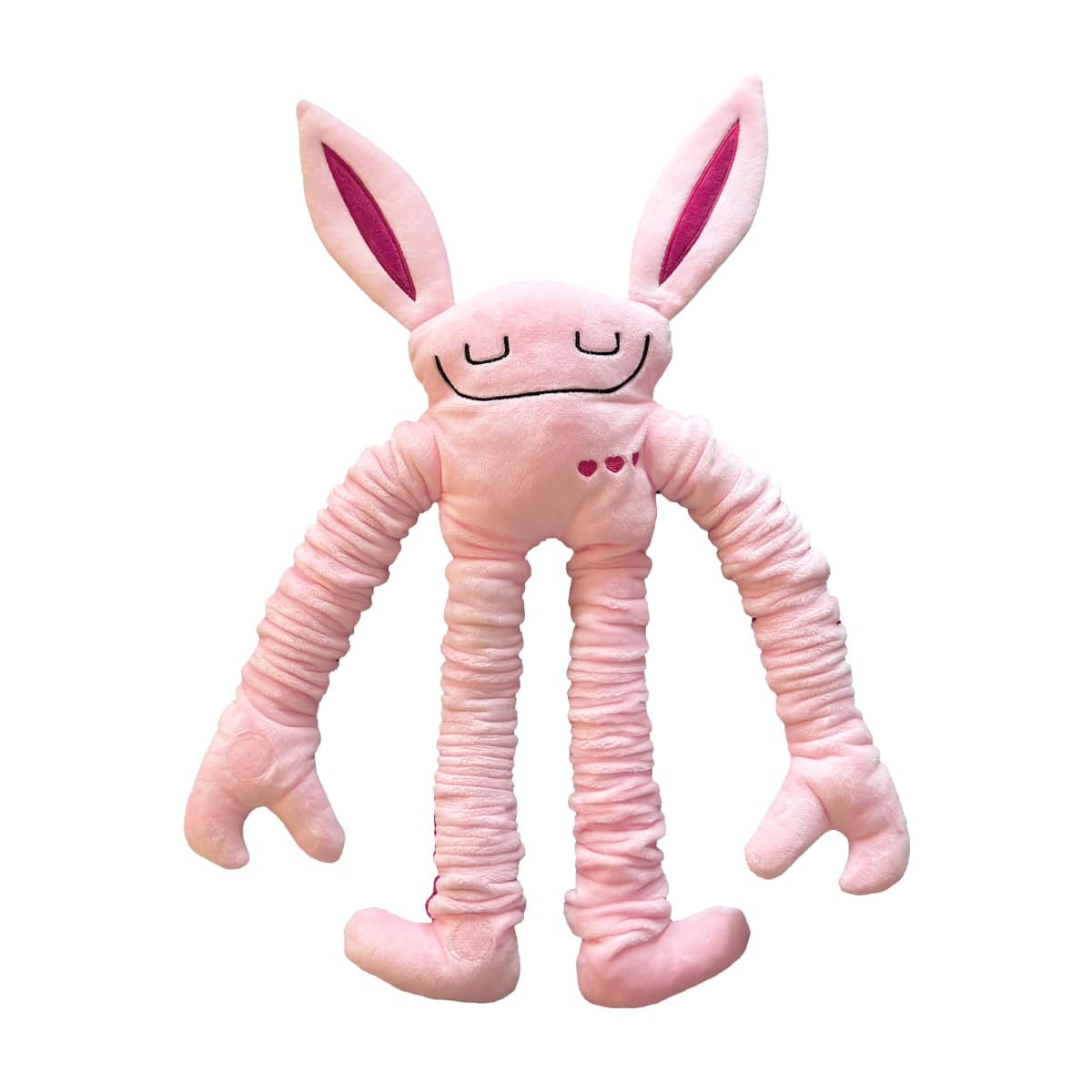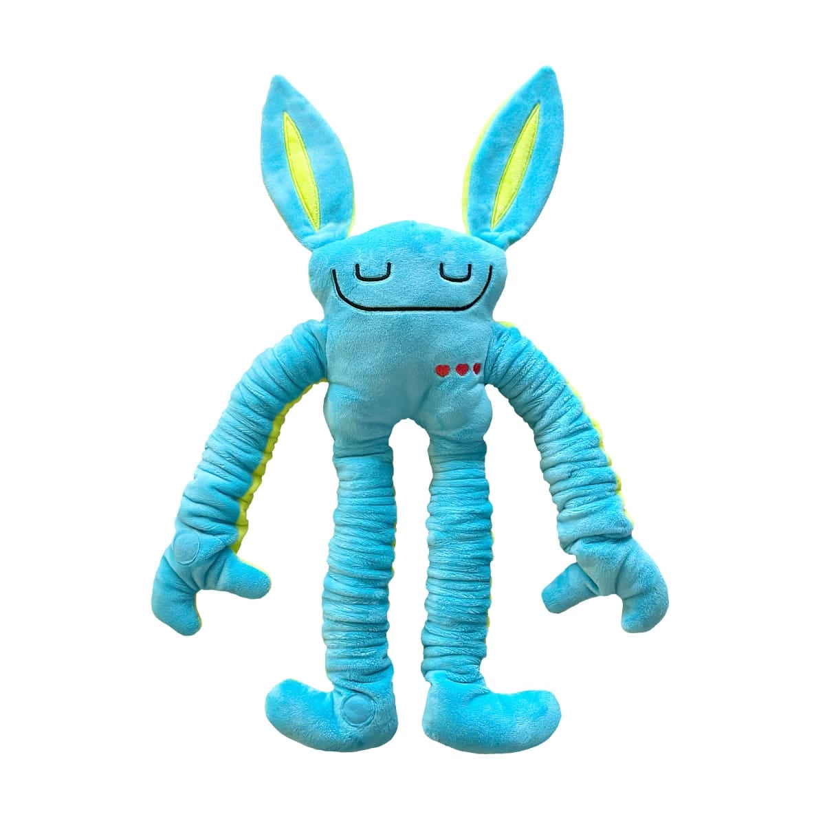 両腕・両脚の内部に、ホース状のプラスチックが内蔵されたぬいぐるみ。ポキポキと引っ張ったり曲げたり
