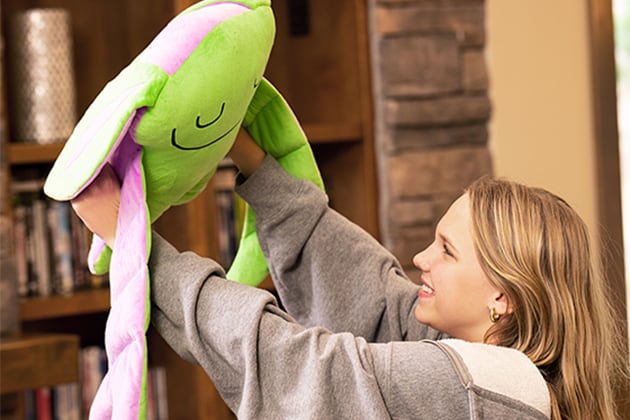 とても繊細な子も、感覚探求タイプのたくさんの刺激を求める子も、誰もが安心して過ごせる「パーソナルスペース」を必要としています。傷ついたり、気持ちが高ぶったりした時、いつでも戻ってこられる安心できる場所があることで、子どもたちは次の活動や、周囲の人々との関わりに安心して向き合えるようになります。もし物理的な場所を確保するのが難しければ、道具がその代わりとなります。バンパスのようなまるで抱きしめられているような温かさや重さ、優しい肌触りを持つぬいぐるみは、子どもたちにきっと安心感を与えてくれるでしょう。