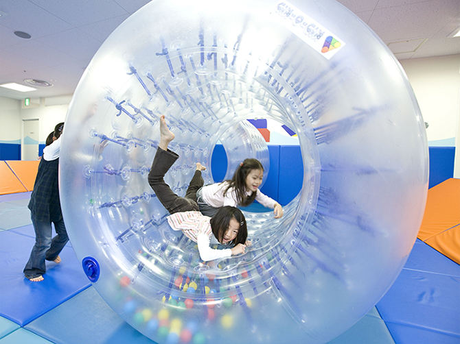 中に入りバランスをとろうとすることで、平衡感覚や筋力、集中力などを鍛え、二人で一緒に中に入ることで、お友だちと一緒に入って回転したり、協力して転がしたりして遊ぶことができます。