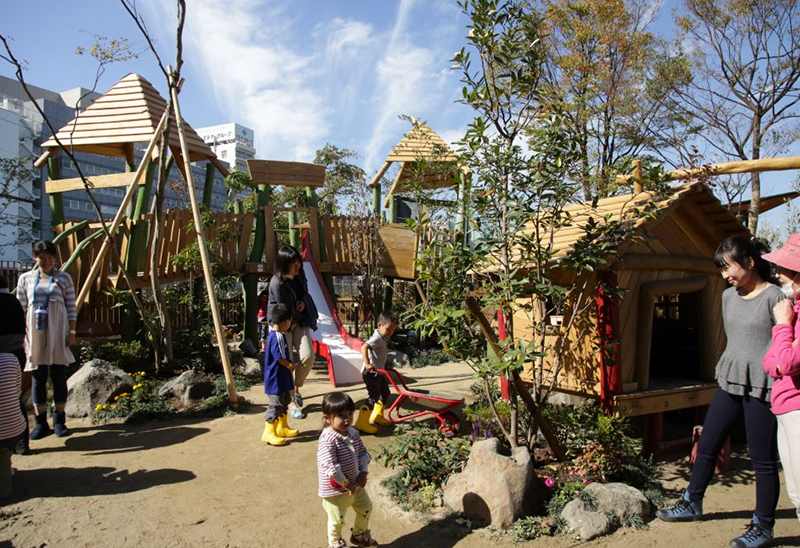 年齢ごとに最適なあそび環境を用意する保育園や幼稚園、子育て支援としてあそびを提供する公共施設、思い切りからだを動かして遊べる公園、お買い物途中にあそびを体験できる商業施設など、社会の中のさまざまな場所にあそびを体験できる環境をつくっています。